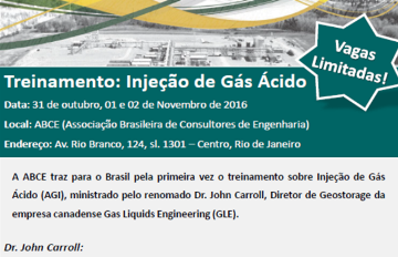 Por primera vez dictado en Brasil: Curso sobre el “Tratamiento de Inyección de Gas Ácido (AGI)”, organizado por ABCE (Associação Brasileira de Consultores de Engenharia) e impartido por el reconocido Dr. John Carroll, director de la empresa canadiense Geostorage Líquidos de Gas Ingeniería (GLE).