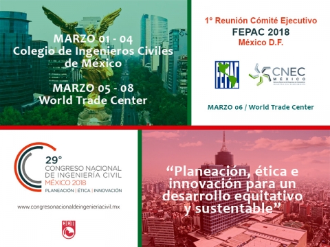 Del 05 al 07 de Marzo de 2018 se realizará la 1era. Reunión del Comité Ejecutivo de FEPAC en la Ciudad de México dentro del marco del 29avo. Congreso “Retos de la Ingeniería Civil en Sudamérica”.